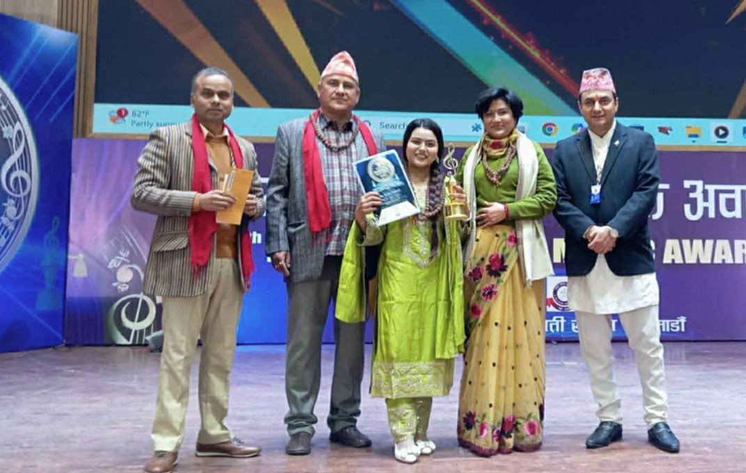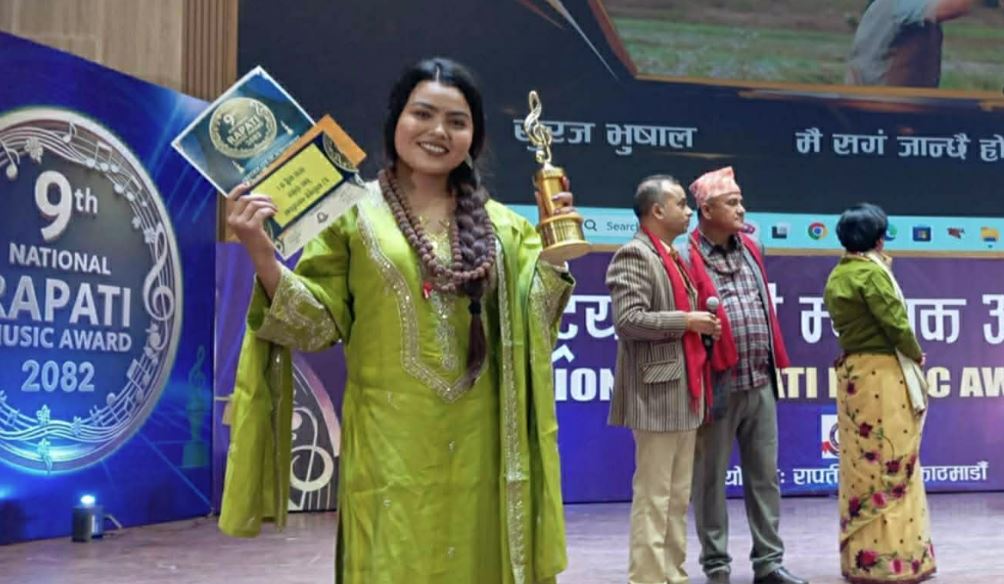 काठमाडौँ । छोटो समयमै नेपाली गीत सङ्गीत क्षेत्रमा सर्वाधिक चर्चा कमाउन सफल गायिका रेखा पोखरेलले काठमाडौँमा सम्पन्न ‘नवौँ राप्ती म्युजिक अवार्ड ‘समारोहबाट उत्कृष्ट नव गायिका विधाबाट अवार्ड हात पार्न सफल भएकी छन् ।